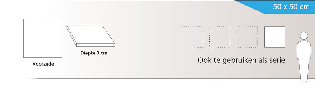 Formaat canvas: 50 x 50 x 3 cm. (dik). Zijkanten worden doorgeschilderd voor een mooi 3D effect.