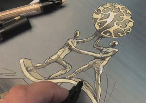 Opmaak: In samenwerking met jou via WhatsApp in groep “KC” (Karikatuur Cadeau) zal directer schetsen en ideeen worden uitgewisseld. Na akkoord worden deze later opgenomen in de illustratie. Als laatste wordt alles verfijnt geïllustreerd en verwerkt tot één artwork en ingekleurd.